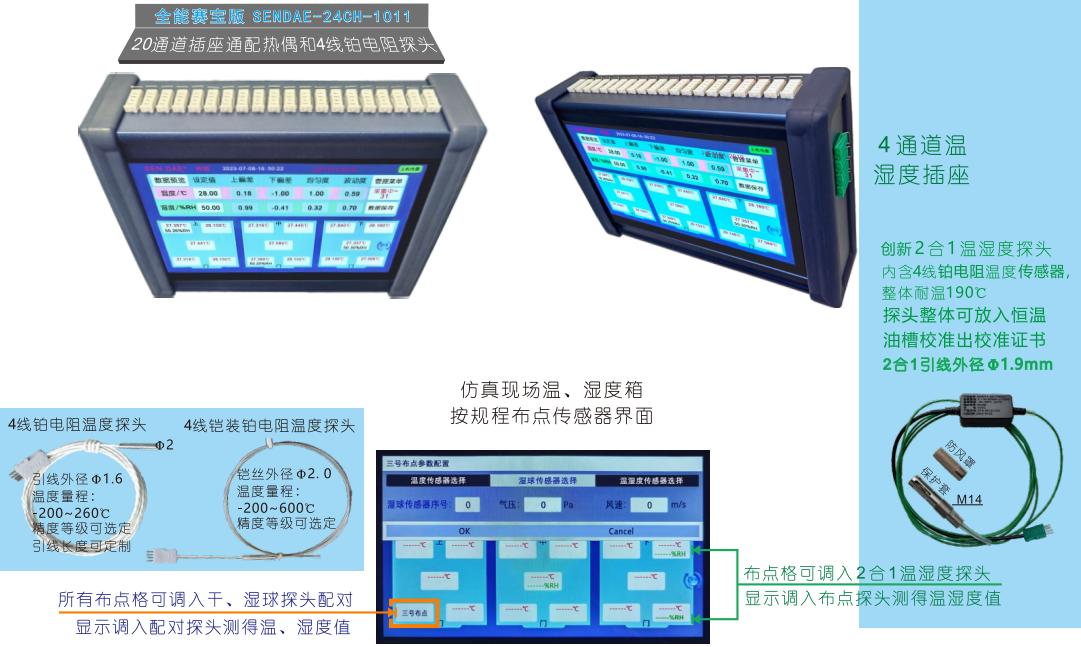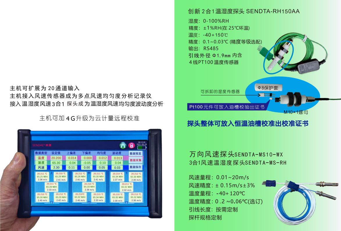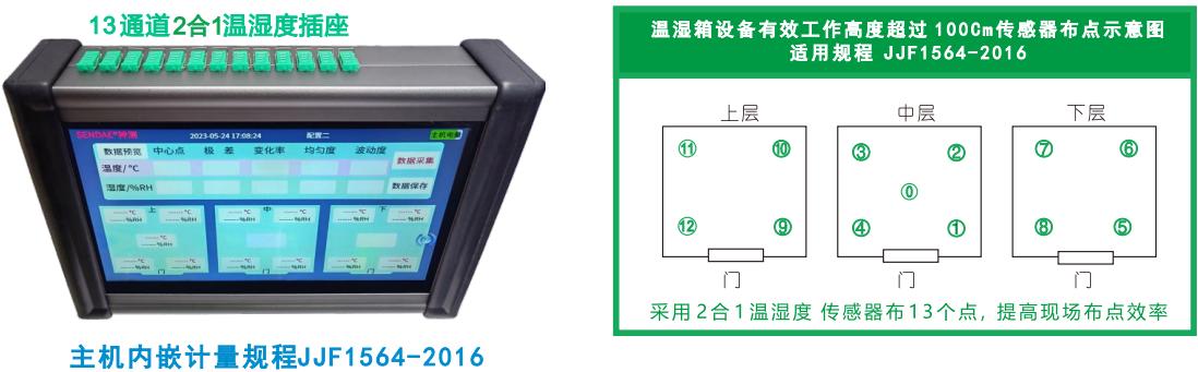采用創(chuàng)新的SENDTA?-RH 2合1溫濕度傳感器得以誕生創(chuàng)新的13通道主機(jī)取代26通道舊模式,創(chuàng)新模式減少現(xiàn)場(chǎng)布傳感器重復(fù)布點(diǎn)工作量,提高現(xiàn)場(chǎng)檢測(cè)效率,創(chuàng)新的2合1溫濕度傳感器的較細(xì)引線對(duì)檢測(cè)溫濕箱時(shí)引線從門(mén)縫引出不會(huì)影響關(guān)門(mén)的密閉性,保障箱內(nèi)的氣體不外泄,不會(huì)因箱門(mén)引線影響箱體內(nèi)的溫濕度場(chǎng)均勻度。