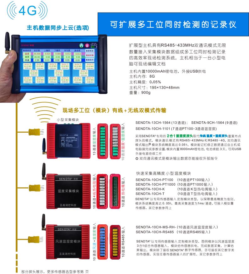 主機(jī)基本參數(shù)參考前面的7”觸摸屏內(nèi)容描述:1~400通道以?xún)?nèi)自設(shè)行列格數(shù)(通道數(shù)),可以理解為想一屏看多少通道就設(shè)多少通道,主機(jī)以接入 SENDTA的模塊數(shù)據(jù)組成多通道記錄分析儀,主機(jī)以接入模塊的 SENDTA傳感器為量程單位而定義主機(jī)的類(lèi)型,比如模塊接入的是溫度傳感器,則主機(jī)是溫度記錄分析儀,多個(gè)模塊接入不同傳感器則主機(jī)是一臺(tái)綜合參數(shù)測(cè)量記錄分析儀,主機(jī)與模塊之間數(shù)據(jù)傳輸以RS485+433MHz(4G)雙模塊雙向通訊。