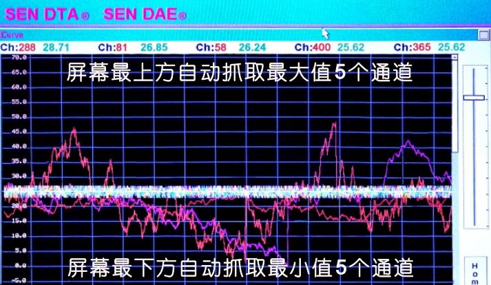 400通道曲線在一屏顯示分析對(duì)比屏幕右側(cè)滑塊上下移動(dòng)調(diào)整量程大小,以便查看超出量程的曲線,屏幕左上角的ch288是所有曲線中較大值通道編號(hào),28.71是即時(shí)測(cè)得值屏幕左上角的ch365是曲線中第5大值通道值是25.62,屏幕下方抓取較小值5個(gè)通道。