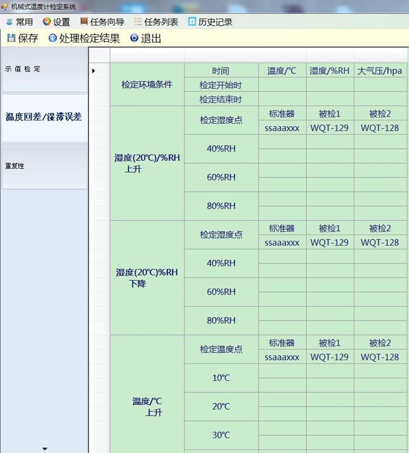 控制程序軟件:檢定人員輸入檢定信息后,程序自動控制設(shè)備升降溫及升降濕,自動監(jiān)控標(biāo)準(zhǔn)器變化,變化率達到要求后,自動采集標(biāo)準(zhǔn)及被檢的數(shù)據(jù)像圖,檢定完成后自動關(guān)閉溫濕度標(biāo)準(zhǔn)箱。待人員完成人工識別后,填寫對應(yīng)數(shù)據(jù),按照相應(yīng)的檢定規(guī)程或校準(zhǔn)規(guī)范自動進行數(shù)據(jù)處理,形成獨立的記錄表格及證書。